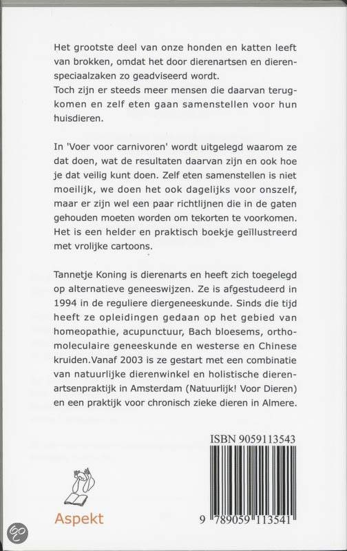Toch zijn er steeds meer mensen die daarvan terugkomen en zelf eten gaan samenstellen voor hun huisdieren. In 'Voer voor carnivoren' wordt uitgelegd waarom ze dat doen, wat de resultaten daarvan zijn en ook hoe je dat veilig kunt doen. Zelf eten samenstellen is niet moeilijk, we doen het ook dagelijks voor onszelf, maar er zijn wel een paar richtlijnen die in de gaten gehouden moeten worden om tekorten te voorkomen. Het is een helder en praktisch boekje geïllustreerd met vrolijke cartoons.